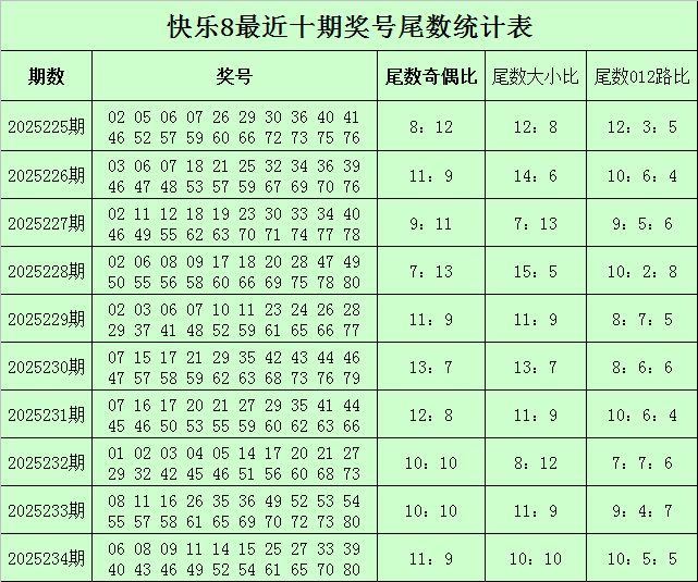 福彩快意8第2025234期开奖讲究:06 08 09 11 14 15 25 27 33 39 40 43 46 49 52 54 61 65 70 80南京涵加枫联教育科技有限公司,其中奖号余数012路比为10:5:5,余数大小比为10:10,奇偶比为11:9。