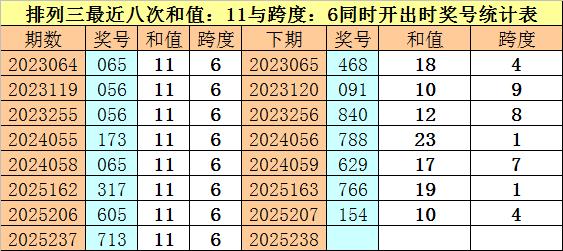 体彩罗列三最近八次同期出现和值:11与跨度:6的奖号差异为:065、056、056、173、065、317、605、713,前七次下期开出奖号差异为:468、091、840、788、629、766、154,详见下表: