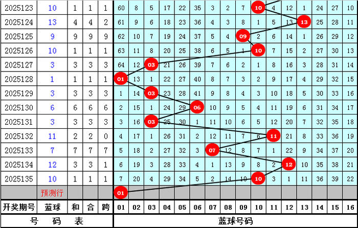 蓝球余数分析:最近7周星期二开出5个蓝球余数,重迭蓝球余数赫然活跃,本周星期二放手近期已出现的蓝球余数,注重温冷蓝球余数回补,矜恤蓝球01。